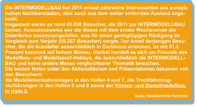 Vom 24. bis 27. März 2011 hat die Faszination Modellbau Karlsruhe den Saisonauftakt 2011 eingeläutet und sich als die Mitmach-Messe schlechthin positioniert.Zu Wasser, zu Lande und in der Luft ließen 372 Aussteller, Marktführer, Kleinserienhersteller aus 10 Ländern (Belgien, Deutschland, Frankreich, Großbritannien, Italien, Luxemburg, Niederlande, Österreich, Schweiz, Ungarn) die Besucherherzen höher schlagen und zeigten auf ihren Messeständen Produkte in den Bereichen Modellbahnen und Zubehör, Flugmodellbau, RC Car und Automodellbau, Truckmodellbau, Militärmodellbau, Schiffs-modellbau, Plastikmodellbau und Kartonmodellbau. Mit 52.000 Besuchern konnte die Faszination Modellbau 2011 annähernd an die letztjährigen Besucherzahlen anknüpfen.Quelle: Messe Sinsheim